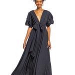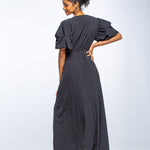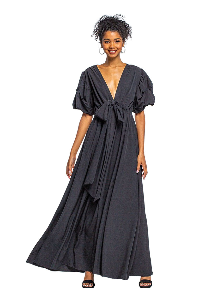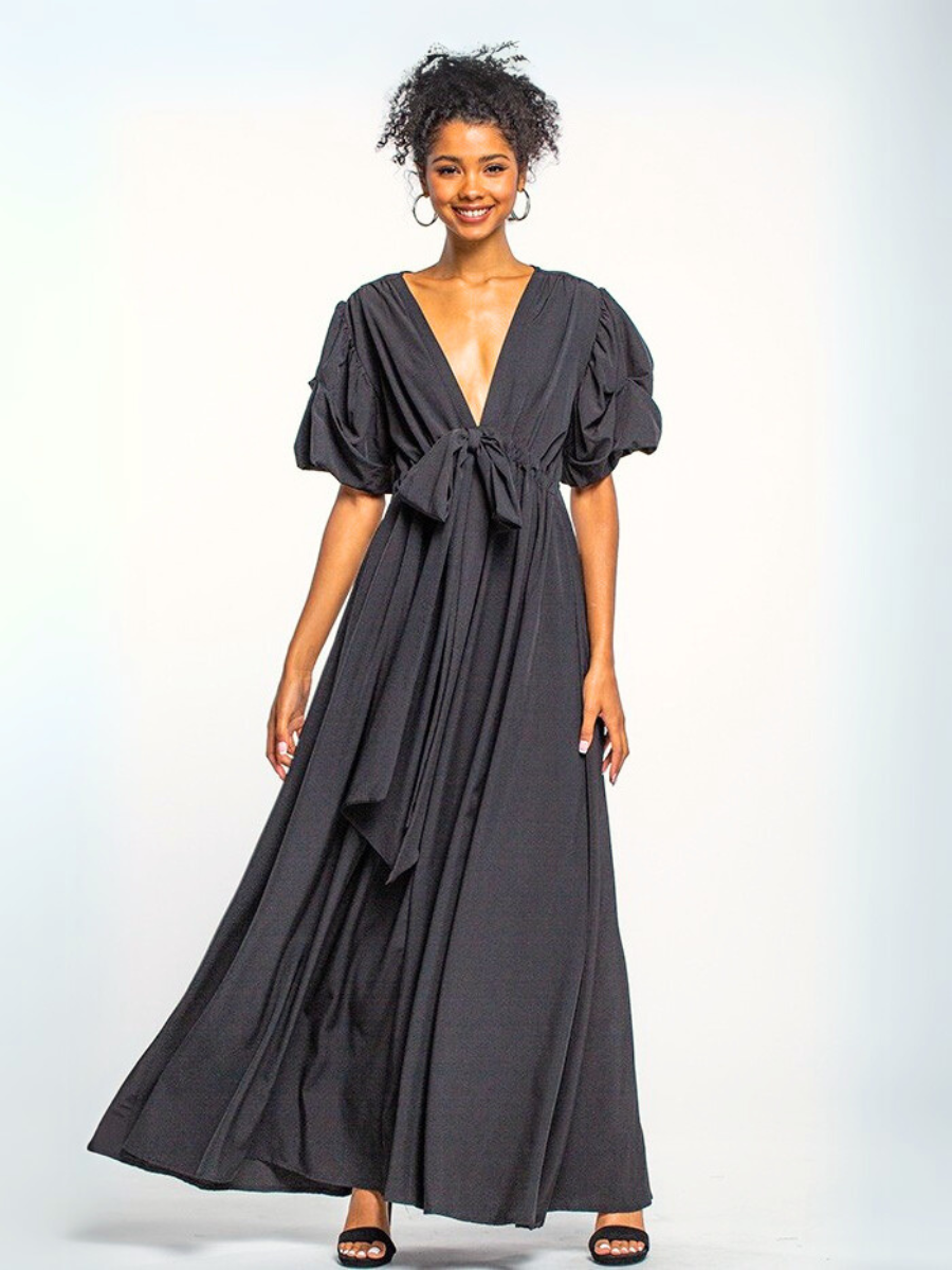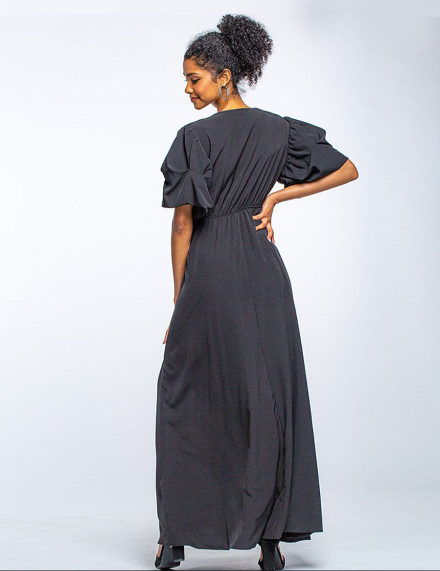 ELEGANT NOIR PUFF-SLEEVE V-NECK LONG MAXI DRESS ESTELA - BLACK