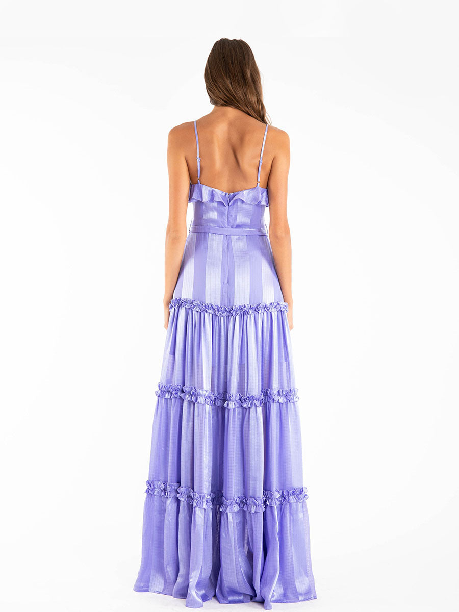Savor the fusion of sophistication and contemporary flair with our Lavender Whispers Satin Stripe Long Maxi Dress in dazzling lilac. This enchanting dress, with its satin sheen and elegant stripes, is a sartorial treasure that marries classic grace with a breath of modern freshness.