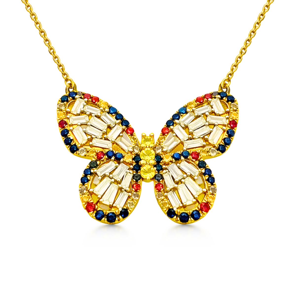 Diamond and Rainbow Sapphire Butterfly Pendant Necklace