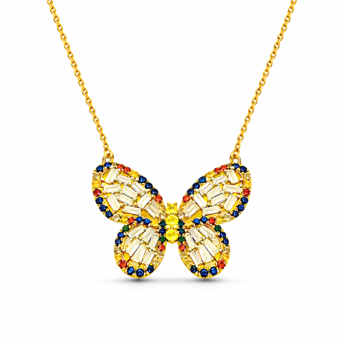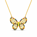 Embrace the enchanting beauty of the MARTINELA Diamond and Rainbow Sapphire Butterfly Pendant Necklace. This exquisite piece captures the delicate elegance of a butterfly, symbolizing transformation and grace. Crafted in lustrous 18k yellow gold, the pendant is adorned with a captivating array of round brilliant diamonds and vibrant rainbow sapphires, creating a dazzling display of color and light. Baguette-cut diamonds form the butterfly's wings, surrounded by a stunning halo of multicolored sapphires in shades of yellow, orange, red, and black, creating a striking visual effect.