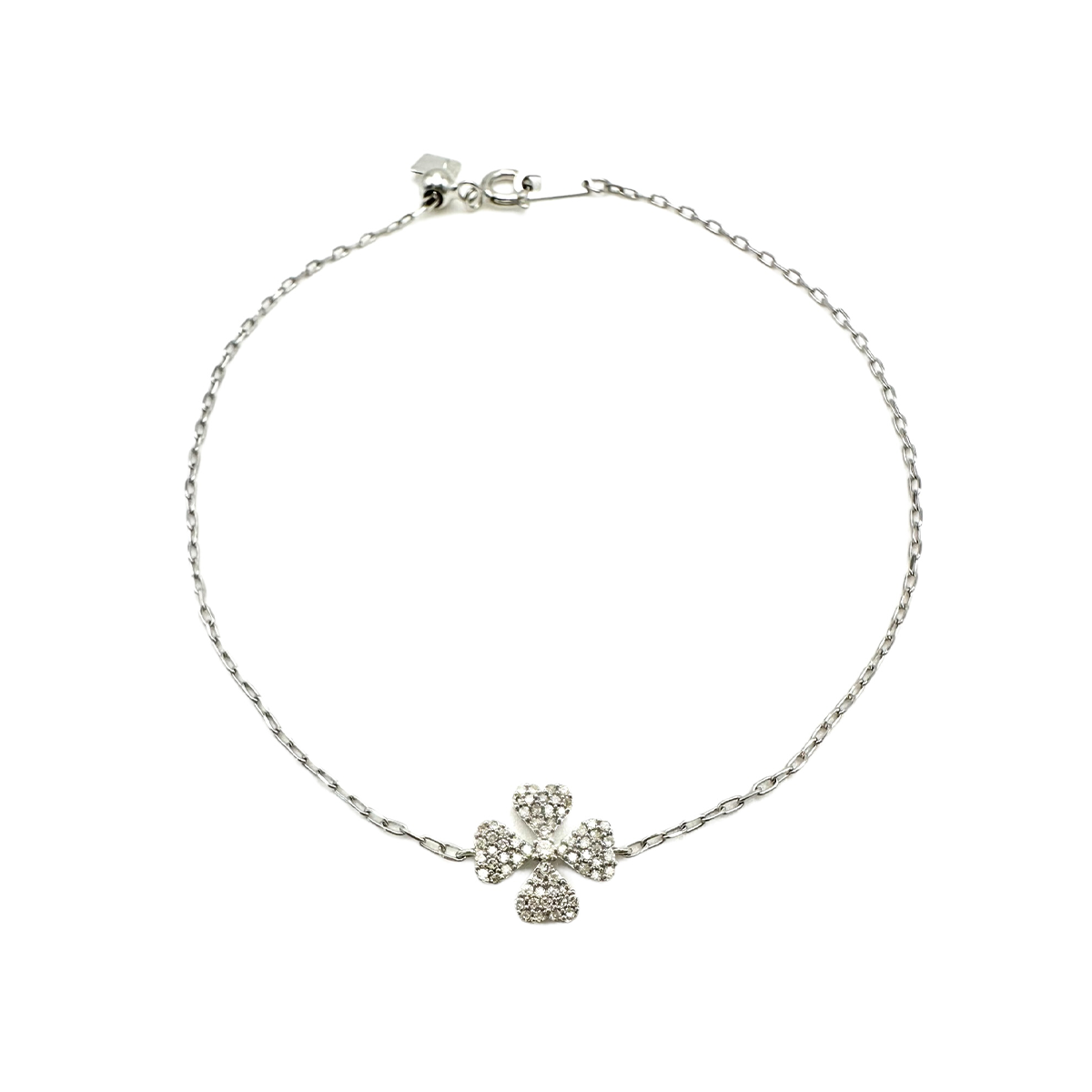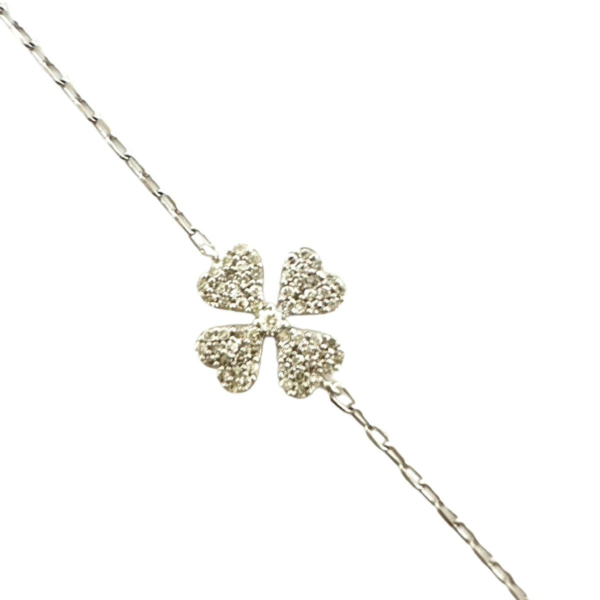 Embrace the charm and elegance of the MARTINELA Diamond Clover Chain Bracelet. This exquisite bracelet features a delicate four-leaf clover pendant, meticulously crafted with sparkling diamonds set in white gold. Each leaf of the clover is adorned with heart-shaped diamonds, creating a minimalist yet luxurious style that makes it an ideal accessory for both everyday wear and special occasions. The bracelet can be effortlessly paired with other pieces or worn alone for a subtle statement. The clover pendant is gracefully suspended from an adjustable fine white gold chain, adding a touch of sophistication and timeless beauty to the design.