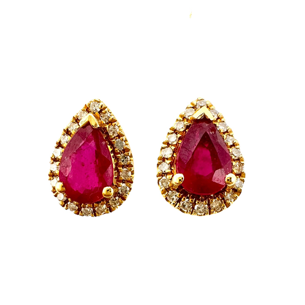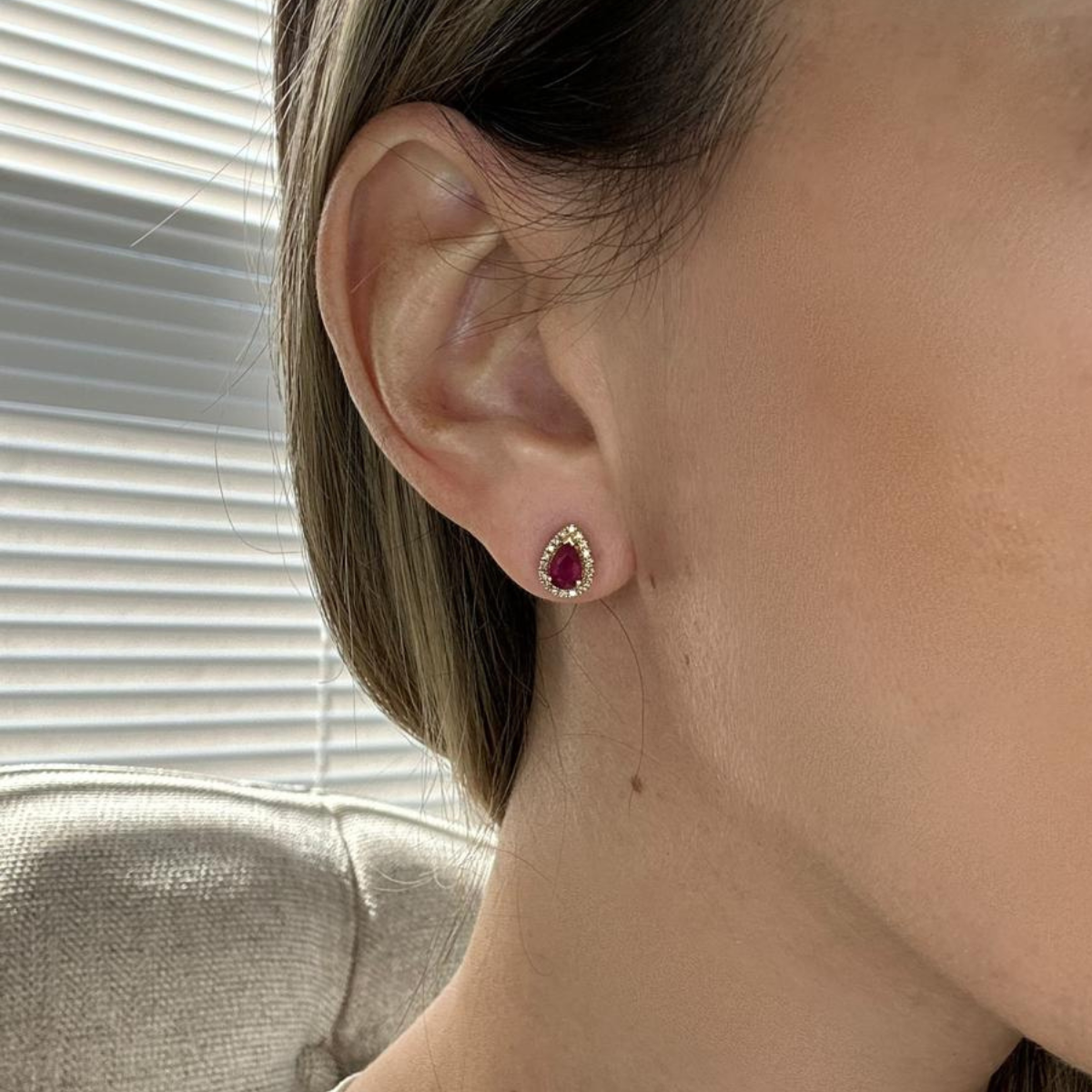 Discover the enduring beauty of the MARTINELA Ruby Pear Stud with Diamond Halo. These remarkable earrings showcase a pear-shaped ruby, masterfully cut to reveal its inherent brilliance and deep red hue. Encircling the ruby is a halo of glittering diamonds, which enhances the vibrant color of the central gemstone while adding an extra touch of sparkle. This striking contrast elevates the ruby’s natural allure, making these earrings a true highlight in any jewelry collection. Crafted in luxurious yellow gold, the design seamlessly blends traditional elegance with contemporary style.