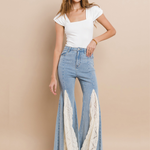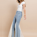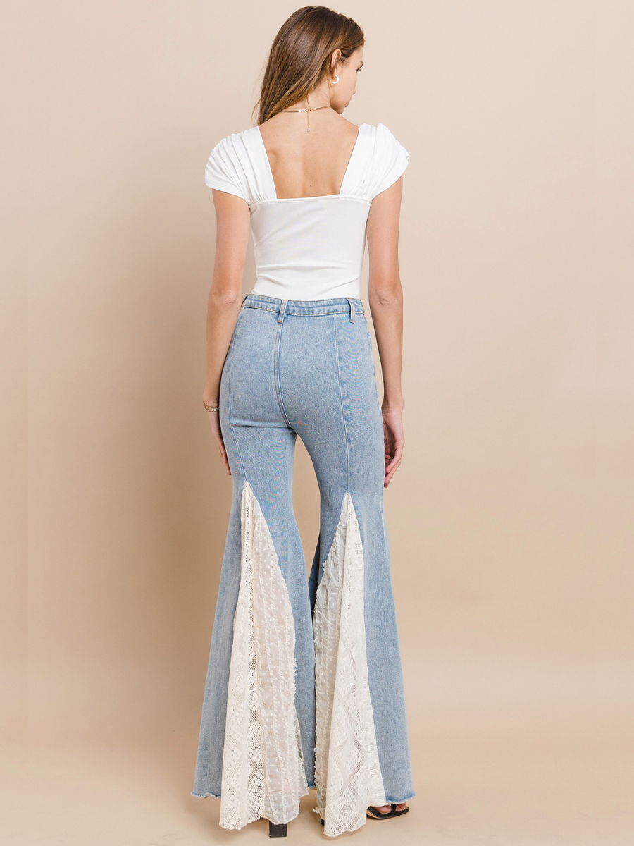 Welcome the new season of style with our Boho-Chic Lace Inset Flare Jeans in Timeless Blue. Merging the free-spirited essence of bohemian vibes with classic denim, these jeans are a sartorial ode to the modern woman who treasures both comfort and panache.